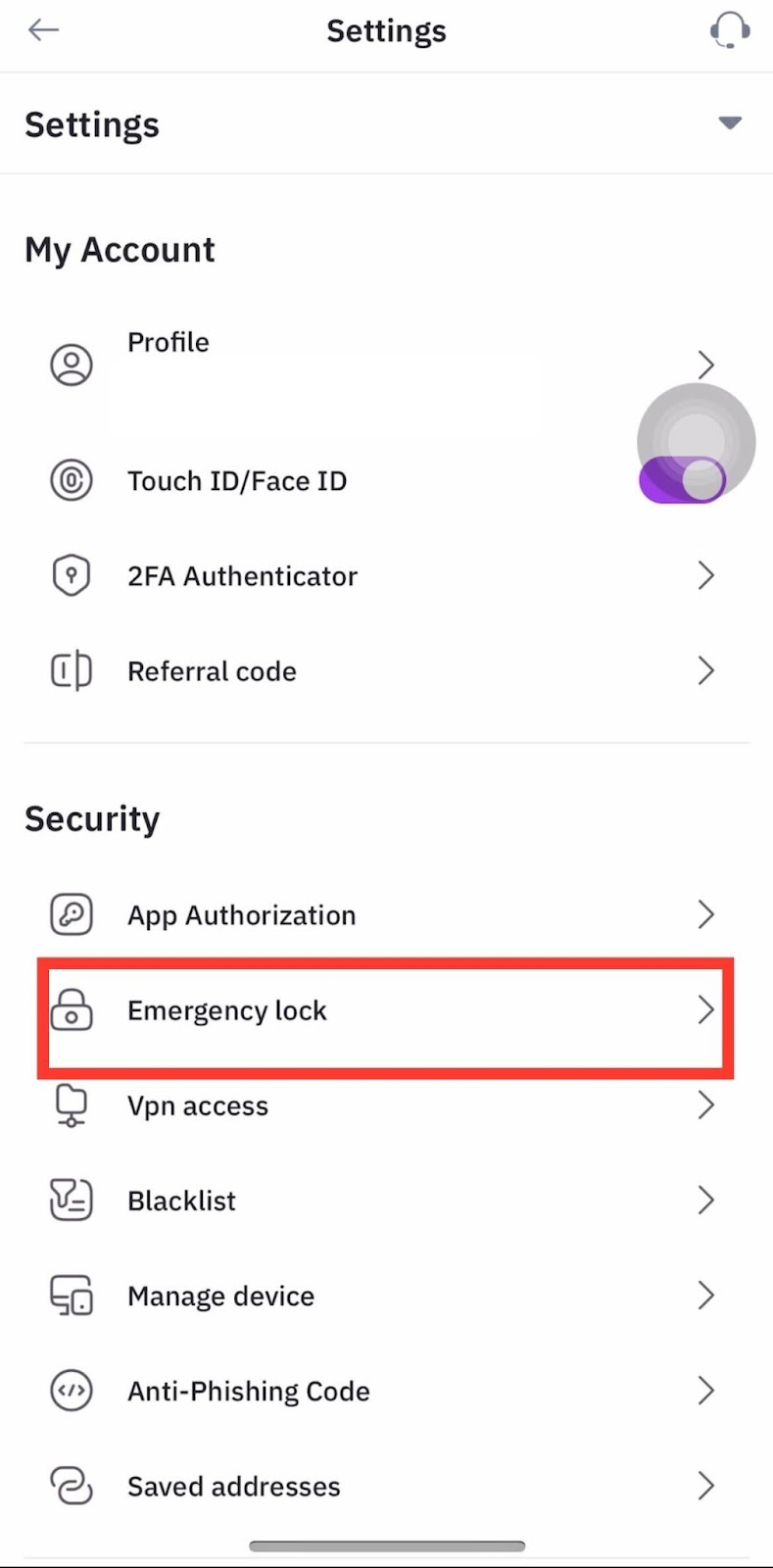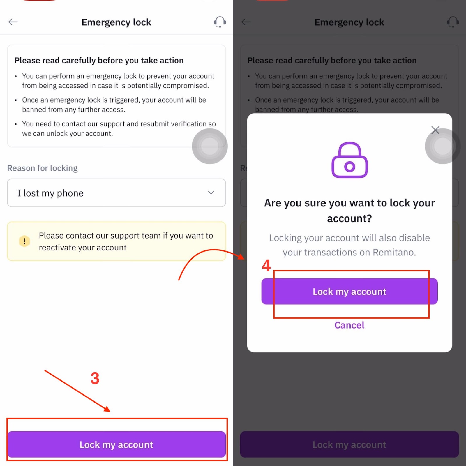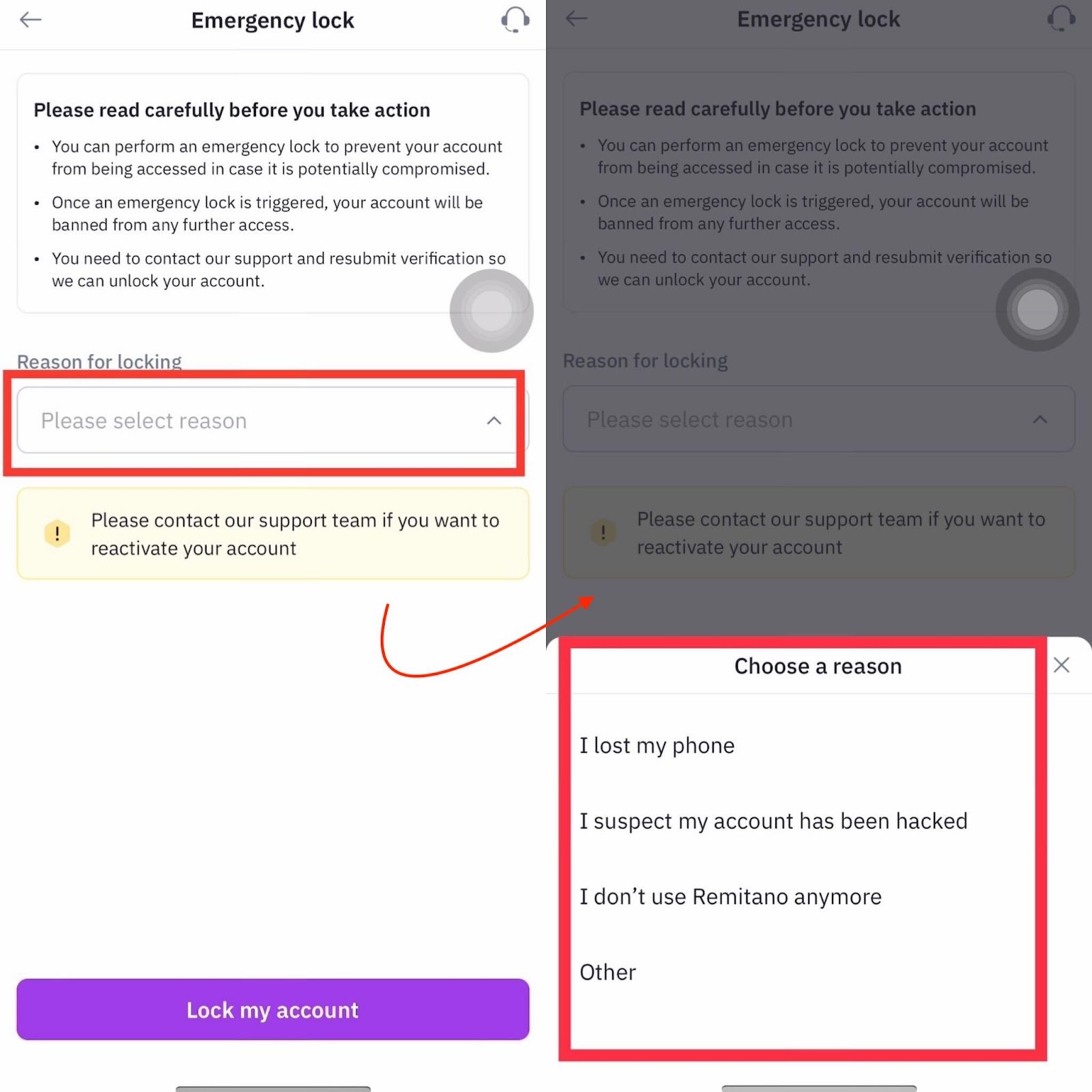 You can lock your account immediately with the EMERGENCY LOCK feature in SETTING.