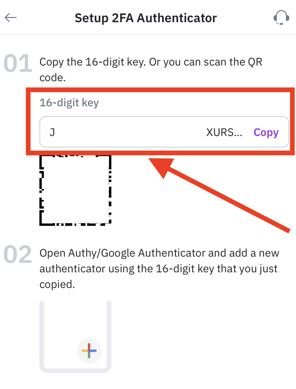 Step 3. Please kindly copy the 16-digit key. Or you can scan the QR code -> Then Open Authy/Google Authenticator and add a new authenticator using the 16-digit key that you just copied.