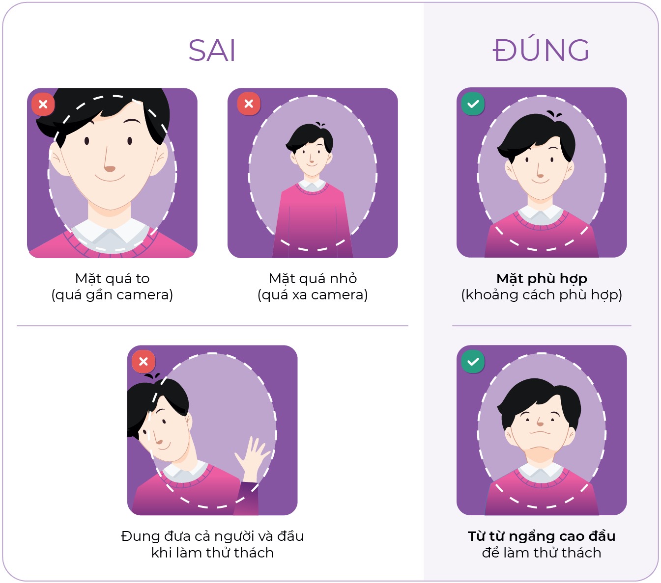 • Trong quá trình thực hiện Xác thực chân dung, bạn sẽ có 20 giây để hoàn thành nên không cần phải quá vội vàng. Vì nếu bạn di chuyển quá nhanh, camera sẽ không thể bắt kịp khuôn mặt của bạn.
