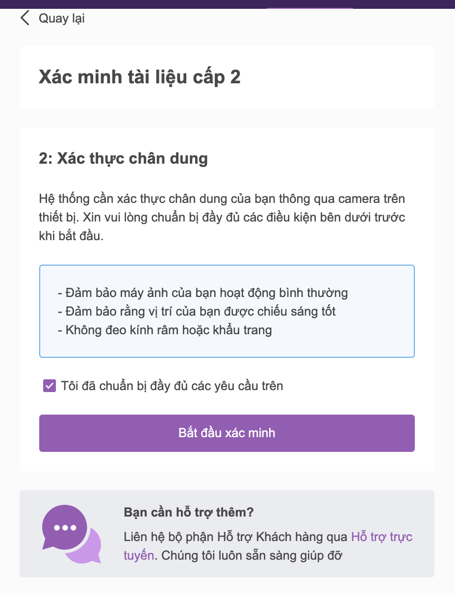 Trong đó, ở cấp độ 2 – cấp độ phổ biến nhất, bạn sẽ cần phải xác minh các tài liệu/giấy tờ tùy thân đã được cấp bởi nhà nước Việt Nam. Và để xác minh rằng bạn là người sở hữu giấy tờ tùy thân đó, chung tôi cần phải xác nhận và so sánh gương mặt của bạn với giấy tờ tùy thân do bạn tải lên.